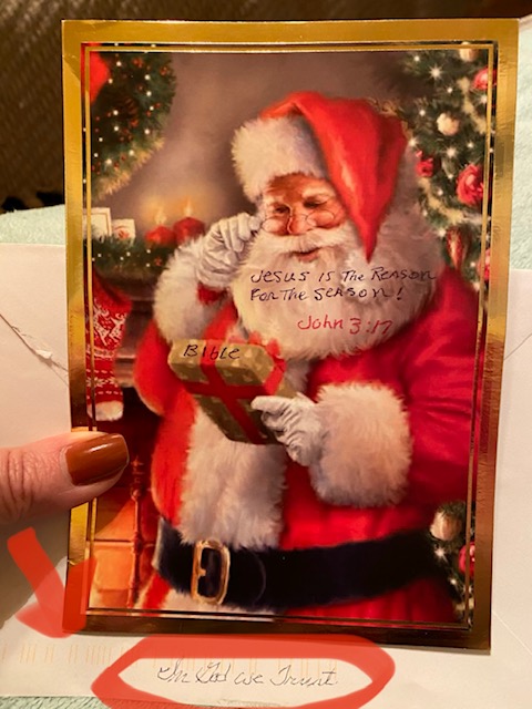 This is the last card that I received from Auntie. Notice the “In God we trust” on the envelope and the scripture on the card.